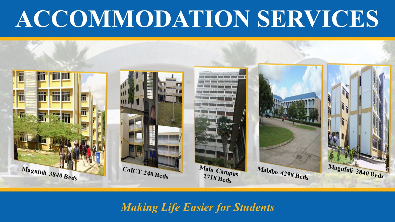 The University offers a range of quality accommodations in the Halls of Residence both on and off-campus. This is handled by a semi-independent unit known as the University Student Accommodation Bureau (USAB), whose offices are located near Hall V at the main campus. There are 7 Halls on campus and are charged at the rate of TZS 800/= per day per bed for undergraduate students. Other accommodation facilities are Mabibo Hostels located 4 km from the Mwalimu Julius Nyerere Mlimani Campus, and the Dr. John Pombe Joseph Magufuli Hostels located relatively nearer the campus, both of which are charged at the rate of TZS 500/=, TZS 2000, and $3/- per day per bed for undergraduate, postgraduate, and international students respectively. Transport from the University to Mabibo Hostel is available 14 hours a day. Residential places for Mlimani Main Campus and DUCE students are also available at Kijitonyama and Ubungo Hostels. Apart from these, both the Dar es Salaam University College of Education and Mkwawa University College of Education campuses have their own student accommodation facilities.