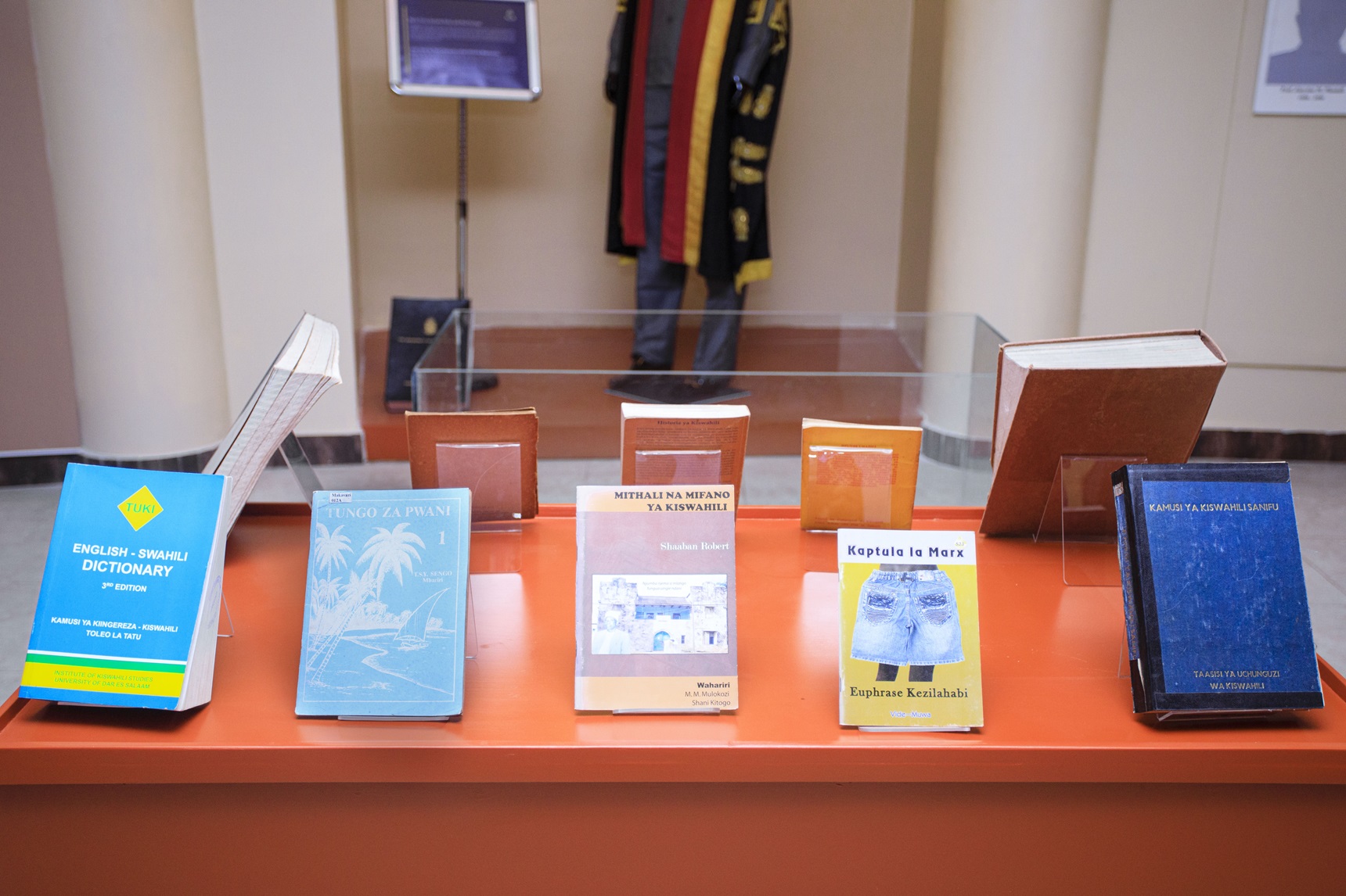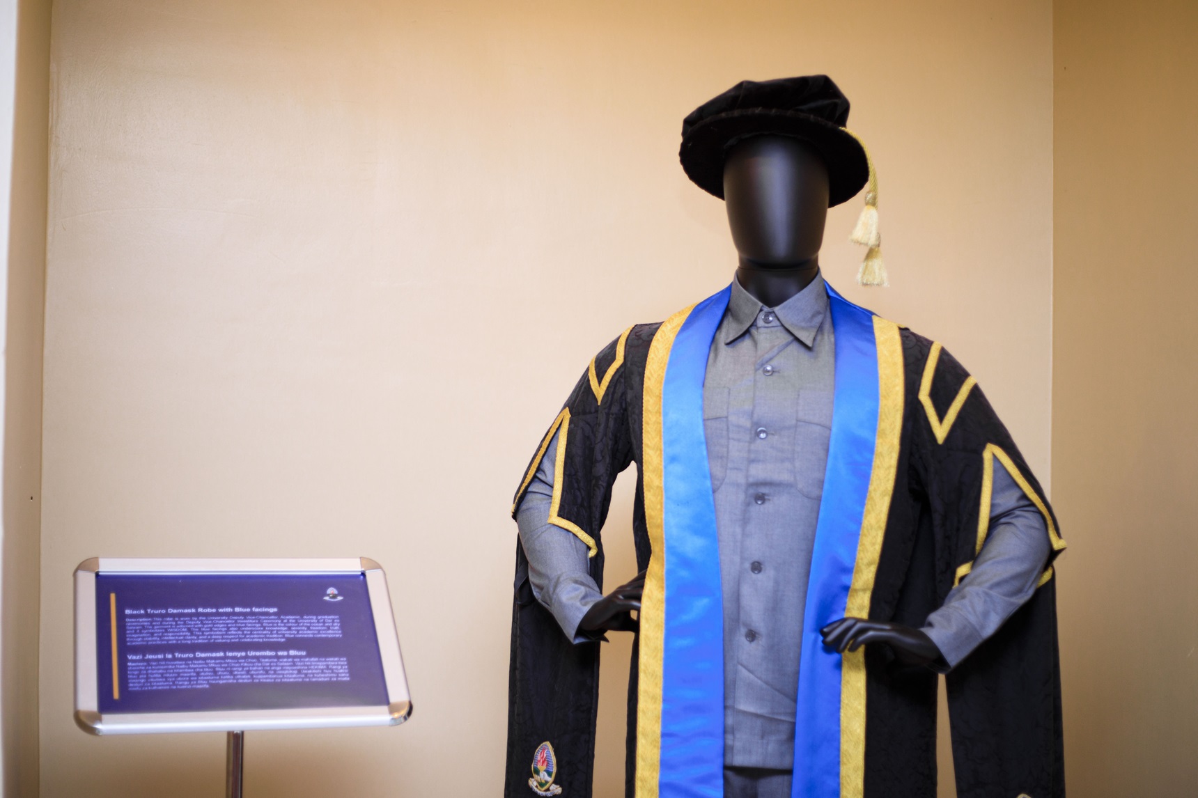 The textile collection contains a few varied objects: flags, wraps, khanga, kitenge, lapel badges used by the university, sewn-on textile badges, but even the T-shirts with the university logo, produced in several colours. The textile collection includes graduation garments worn by the top leadership of the university.